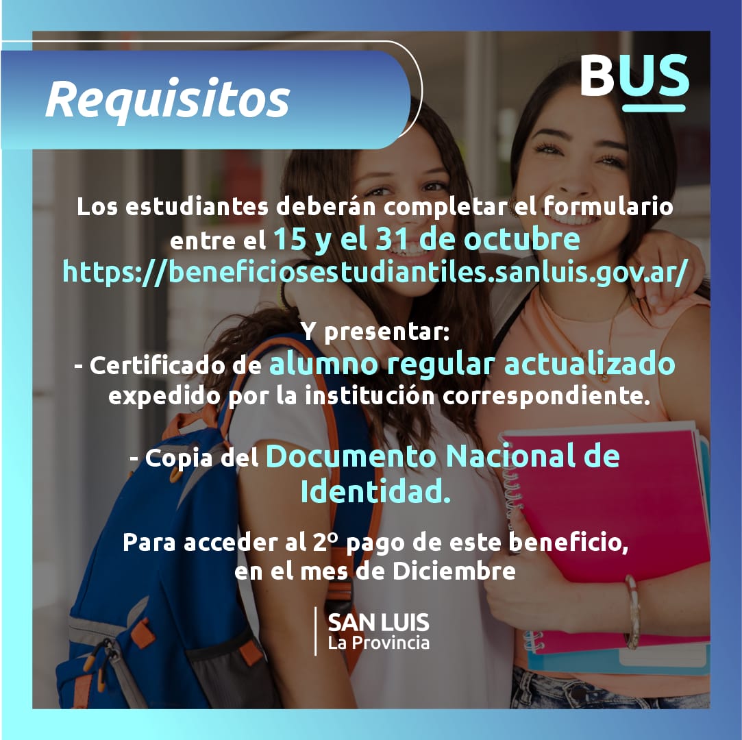 Para acceder al segundo pago, los estudiantes deberán completar el formulario disponible en la página web de la dirección de Beneficios Estudiantiles, que estará habilitado entre el 15 y el 31 de octubre. Allí deberán adjuntar la constancia de alumno regular emitida por la institución de educación Superior (con fecha actual) y una foto del DNI, frente y dorso.