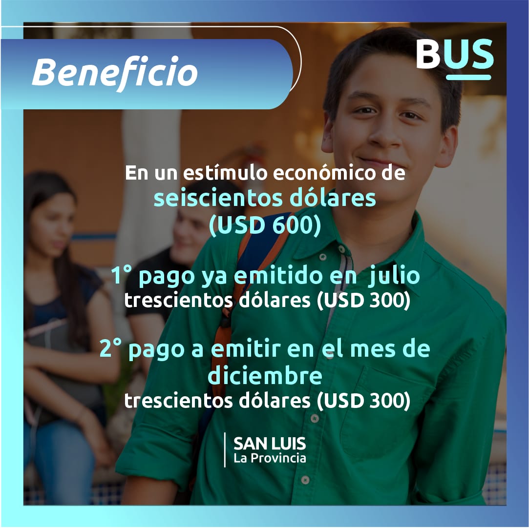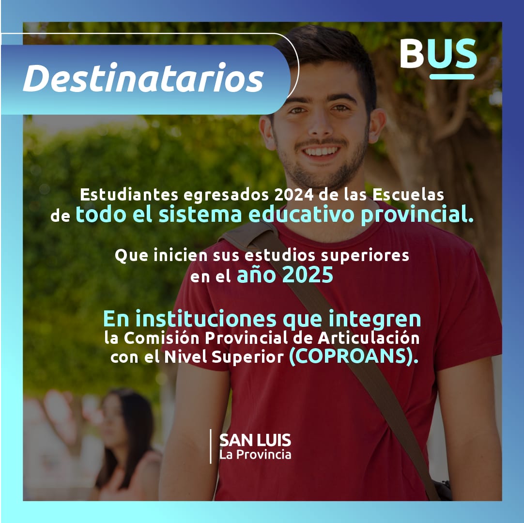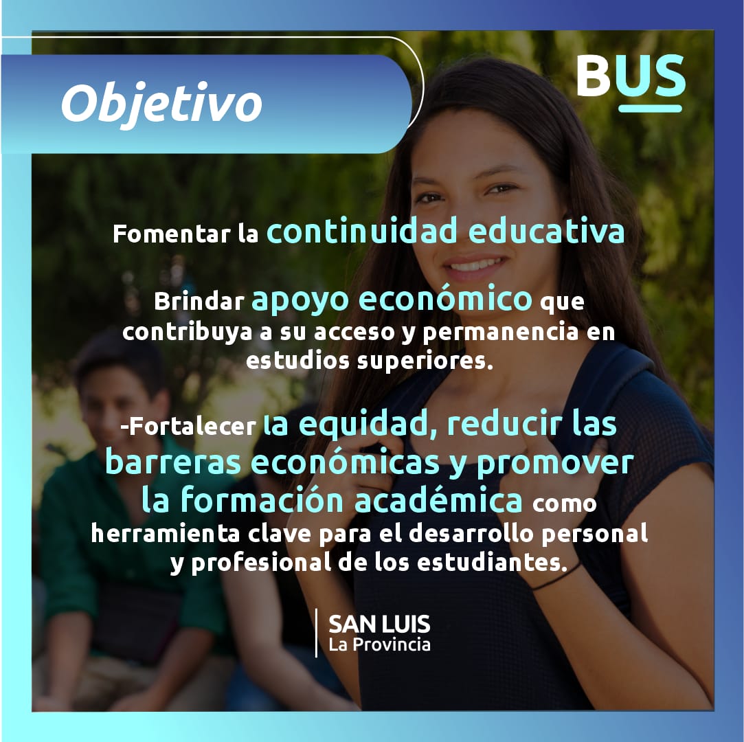 La BUS fue creada con el objetivo de fomentar la continuidad educativa y acompañar a los egresados del nivel Secundario en el inicio de su formación superior. Está destinada exclusivamente al primer año de cursada y otorga un apoyo económico total de 600 dólares, distribuido en dos pagos de 300 dólares cada uno: el primero se realizó en julio y el segundo se efectuará en diciembre. Esta ayuda busca contribuir con los gastos propios de la nueva etapa académica.