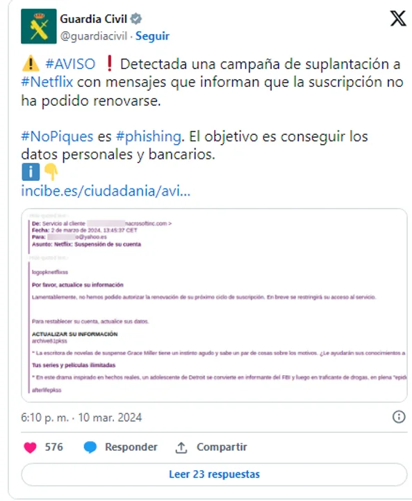 Según se indica en un post en X, los criminales envían correos electrónicos a sus víctimas. En él se indica que es necesario que se actualicen los datos de pago, porque, sino, la suscripción no se renovará. No es la primera vez que se usurpa a Netflix, que ya le ha sucedido algo parecido pero con SMS.
