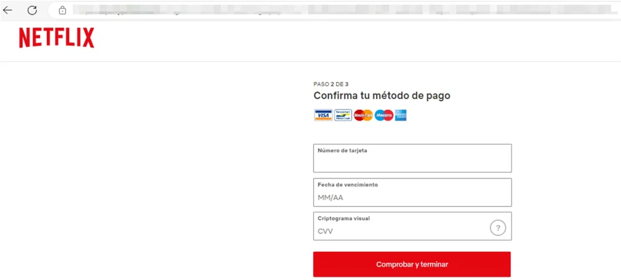 En el propio correo se incrusta un enlace, que redirige a una web falsa que emula la de Netflix. Es en ella donde se implementa un cuestionario con diversos campos en el que la víctima introducirá su información personal, como su nombre, dirección o código postal. Luego avanzará al siguiente cuestionario, que le pedirá la información bancaria.