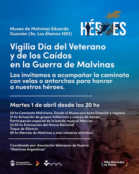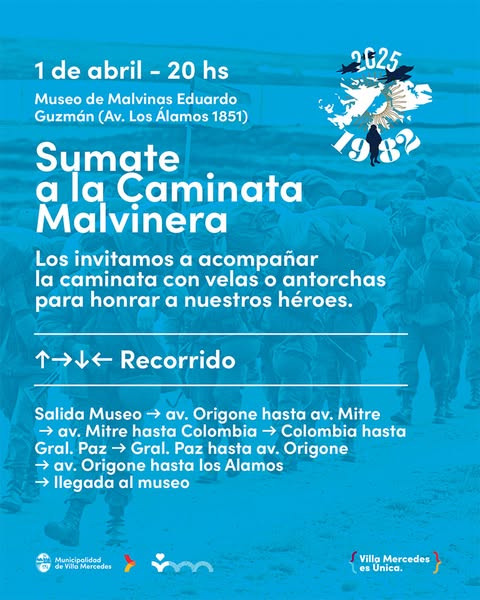 A las 20 hs. dará inicio la Caminata Malvinera, partiendo desde el Museo de Malvinas Eduardo Guzmán, ubicado en Av. Los Álamos 1851. Se invita a los participantes a llevar velas o antorchas como símbolo de respeto y reconocimiento a los héroes y caídos de Malvinas.