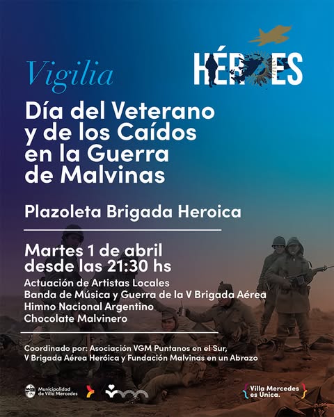 Paralelamente, a las 21:30 hs. en la plazoleta Brigada Heróica, se realizarán más presentaciones artísticas con la participación de artistas locales y la banda musical de la V Brigada Aérea. Este evento es organizado por la Asociación VGM Puntanos en el Sur, V Brigada Aérea Heróica y la Fundación Malvinas en un Abrazo.