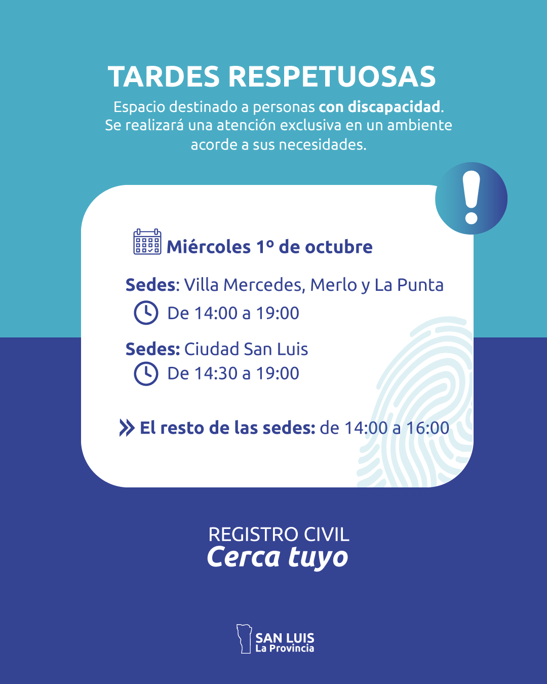 Este miércoles 1° de octubre, las sedes de Villa Mercedes, Merlo y La Punta atenderán de 14:00 a 19:00, mientras que en la ciudad de San Luis el horario será de 14:30 a 19:00. En el resto de las sedes provinciales, la franja especial se desarrollará de 14:00 a 16:00.